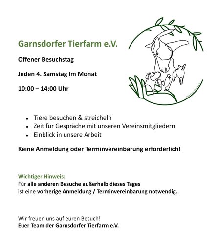 Die Garnsdorfer Tierfarm ist ein liebevoll geführter Gnadenhof, auf dem Tiere, die in Not geraten sind, ein dauerhaftes Zuhause finden.